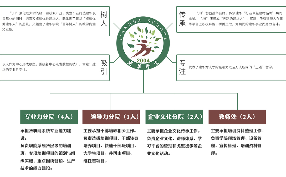 目 的:為了踐行“以人為本”的企業(yè)理念,更好地完善集團(tuán)公司的人才梯隊(duì)建設(shè),以重視人、尊重人、提升人為出發(fā)點(diǎn),使公司管理人員和專業(yè)技術(shù)人員的能力素質(zhì)能跟上集團(tuán)快速發(fā)展的要求和步伐,特成立建華學(xué)院。建華學(xué)院擔(dān)負(fù)著不斷地提升人、培養(yǎng)人的重要使命!